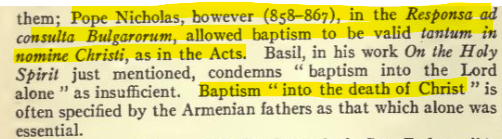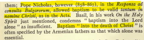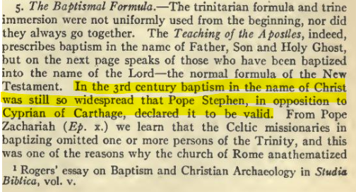 - Hastings Dictionary of the Bible (1898, p. 88): “It must be acknowledged that the threefold name has no early support as the baptismal formula, and that the baptism was in fact done in the name of the Lord Jesus.”